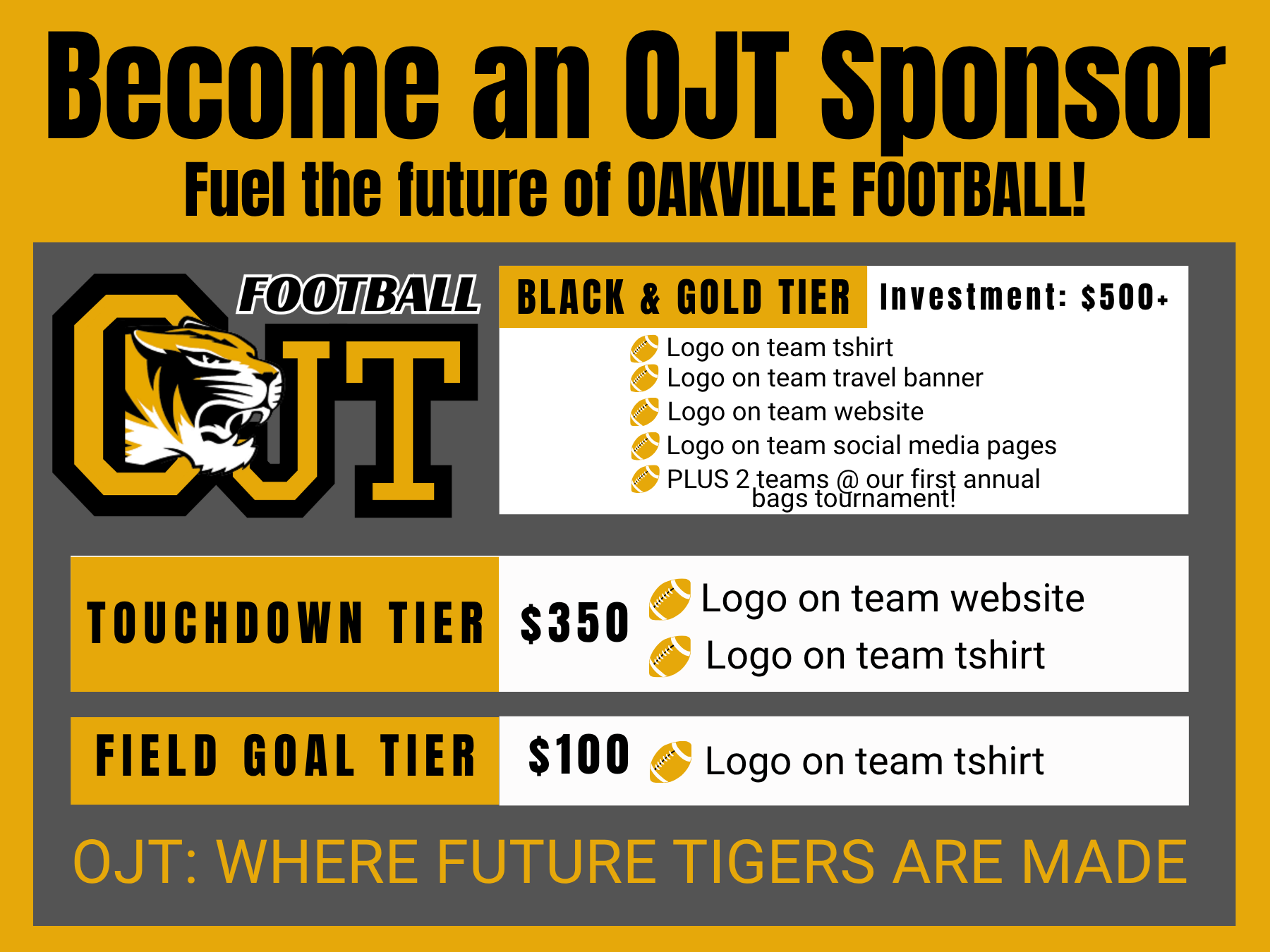 Sponsorships are a great way to support the Oakville Junior Tiger Football Program. Your support is more than just a donation—it’s an investment in the Grit, Growth, and Leadership of our future Oakville Tigers. From GameDay banners to digital highlights, we offer several ways to showcase your business to our dedicated community of families and fans.